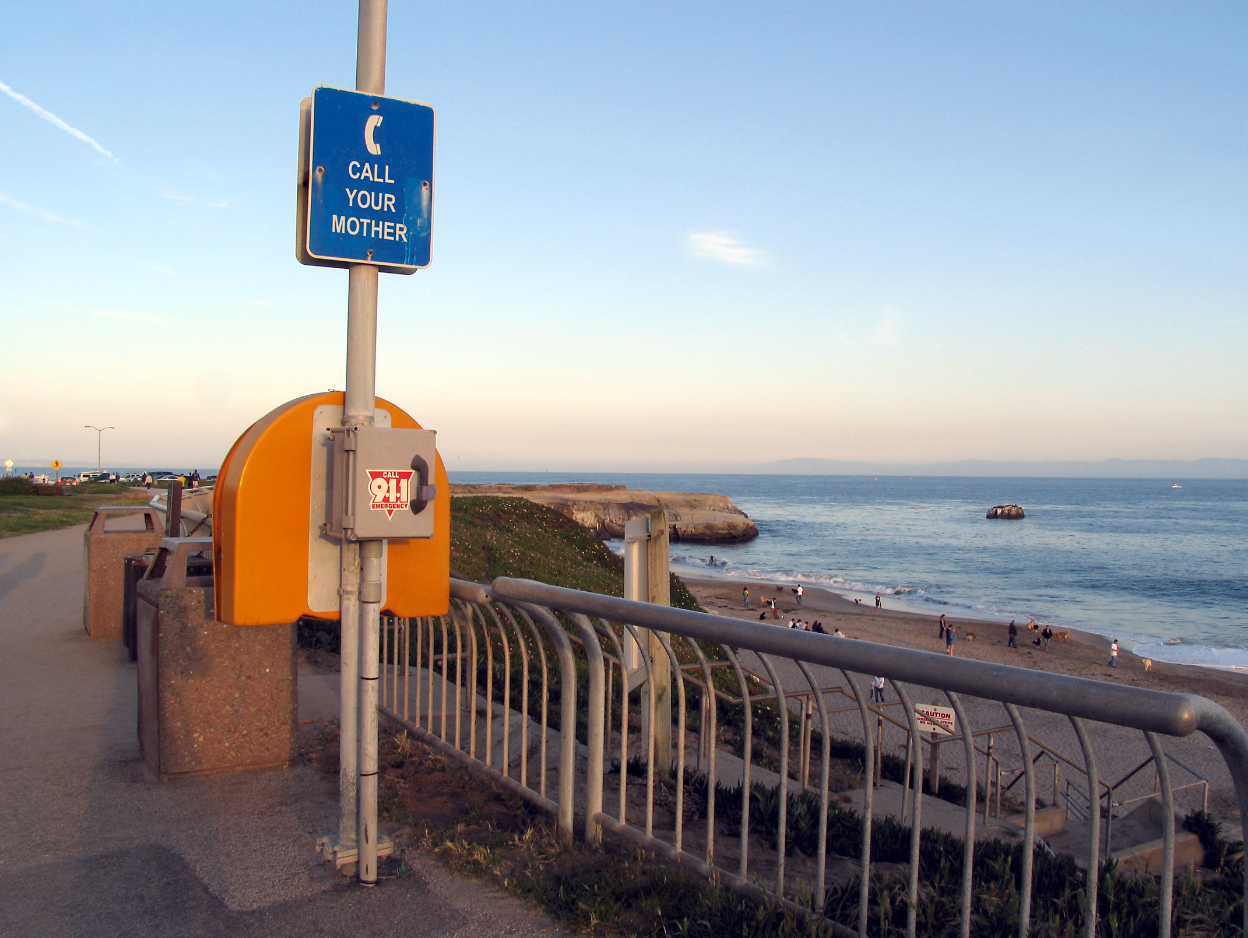 When you are in trouble, who are you going to call? 911 or your mother? Well, although we love our mothers, most of us would opt for the police or 911 when we have an emergency. If you are walking along this beach and need help, you can run to the phone mounted on the pole.