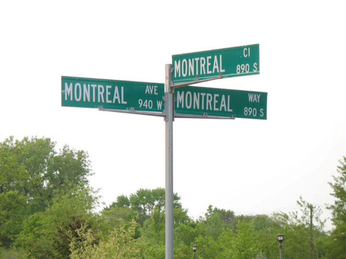 Have you ever been confused by the difference between a road and an avenue or a street? When you approach this sign, all roads point to Montreal. It doesn't matter whether you are looking for Montreal Avenue or Montreal Street, you will end up in Montreal regardless of the route you follow. This sign shows either that you need to know the difference between avenue and street or that it's all the same.